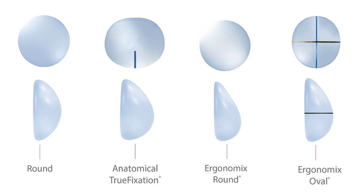 Los implantes mamarios pueden ser redondos, ovalados o con contorno, y vienen en distintos tamaños y proyecciones. Históricamente, los implantes redondos se han utilizado para aumentar el llenado del polo superior de los senos, mientras que los ovalados y los «anatómicos» fueron diseñados para asemejar la forma natural de los senos, con más volumen en el polo inferior. La colocación de estos implantes en forma de gota requiere una técnica más avanzada y pueden asociarse con complicaciones tales como la rotación del implante o resultados estéticos no deseados. Las mujeres que buscan una apariencia y sensación más naturales en un implante mamario pueden encontrar la solución en la novedosa línea Ergonomix™ de Motiva Implant Matrix®.